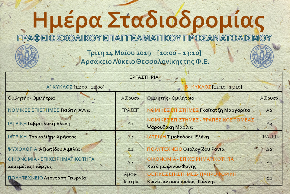 Το Γραφείο Συμβουλευτικής και Επαγγελματικού Προσανατολισμού του Αρσακείου Λυκείου Θεσσαλονίκης διοργανώνει την Τρίτη 14 Μαϊου 2019 [11.οο-13.10] την «Ημέρα Σταδιοδρομίας»: πρόκειται για μια δράση που ενημερώνει αλλά και διευρύνει τους ορίζοντες των μαθητών και μαθητριών της Α΄ και Β΄ Λυκείου, οι οποίοι βρίσκονται στη διαδικασία λήψης εκπαιδευτικών και επαγγελματικών αποφάσεων.