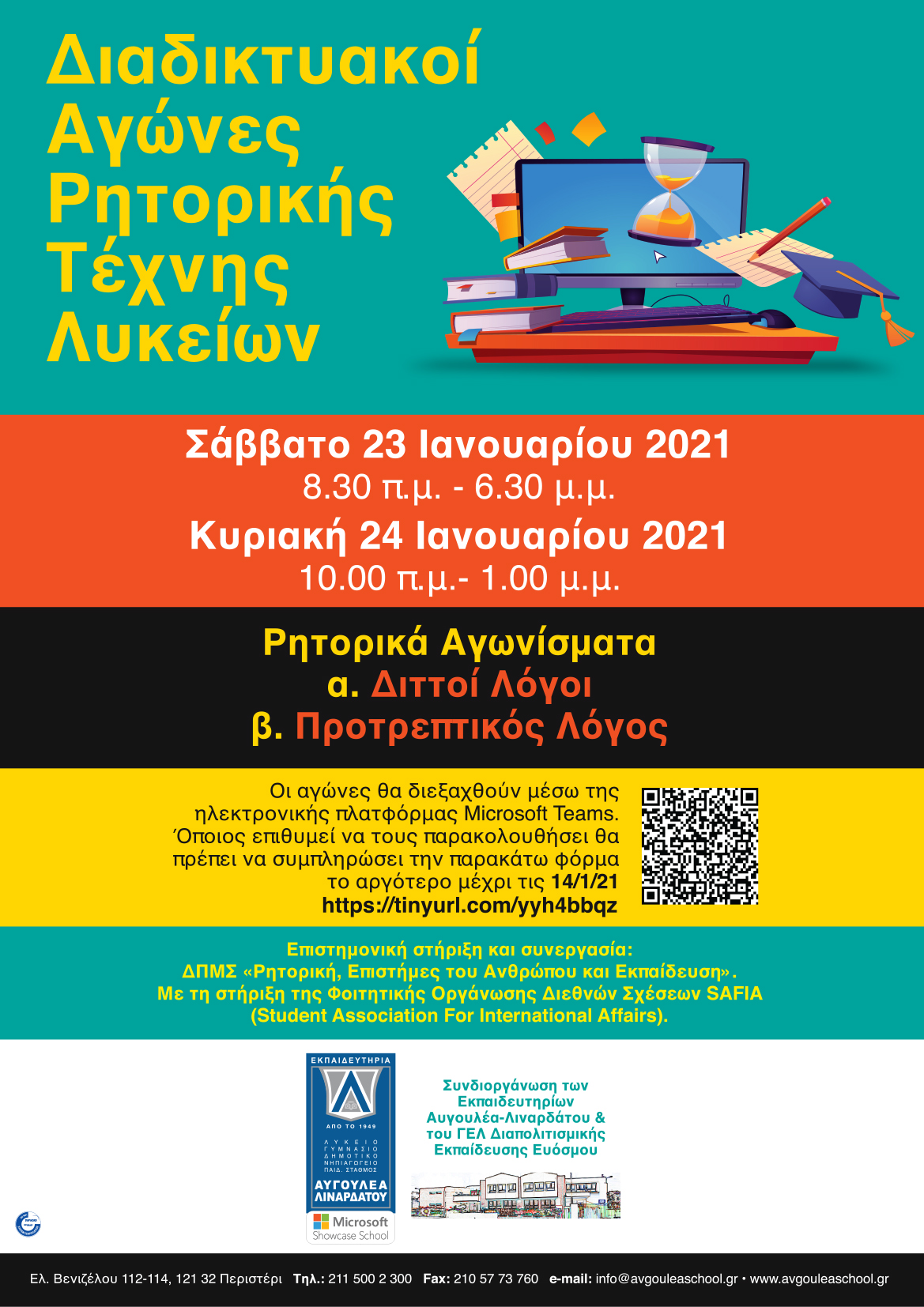 Το Σαββατοκύριακο, 23-24 Ιανουαρίου του 2021, το Αρσάκειο Γενικό Λύκειο Θεσσαλονίκης συμμετείχε στους Διαδικτυακούς Αγώνες Ρητορικής Τέχνης Λυκείων που συνδιοργάνωσαν τα Εκπαιδευτήρια Αυγουλέα-Λιναρδάτου σε συνεργασία με το ΓΕΛ Διαπολιτισμικής Εκπαίδευσης Ευόσμου, με την συμμετοχή 27 Λυκείων από όλη την χώρα.